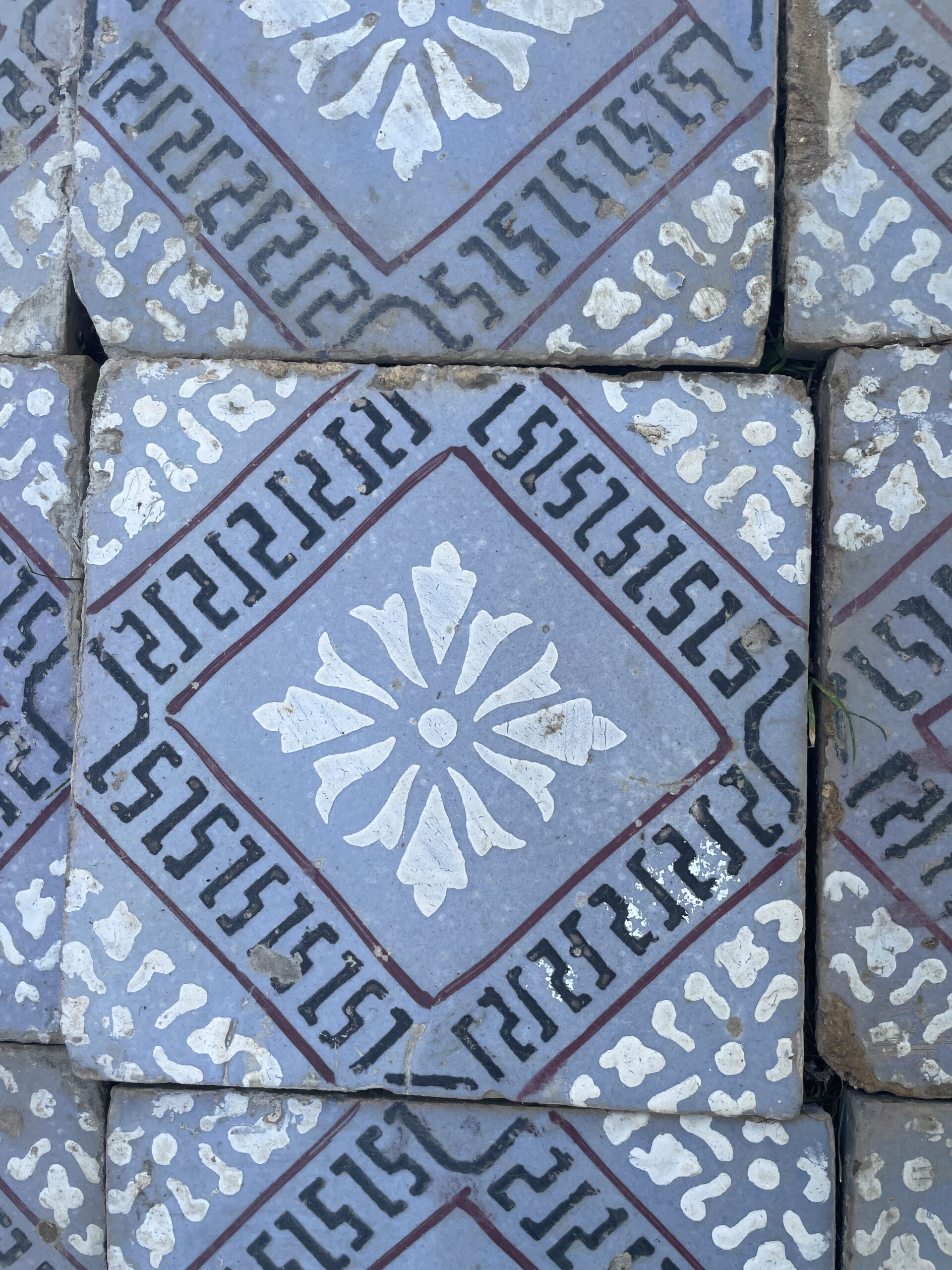 19th century Italian Majolica terracotta tiles.Hand made tiles from Southern Italy, all with their original makers mark. 20cm x 20cm (8″) approx 1 ” thick.
