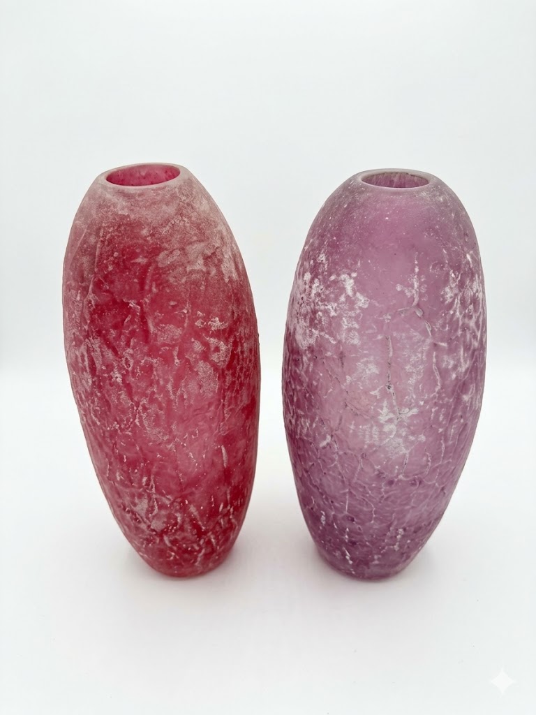 This pair of Cenedese vases is a tour de force of textural experimentation, representing the pinnacle of the Scavo technique that defined high-end Murano glass in the mid-to-late 20th century. These pieces are less like traditional glassware and more like geological artifacts, capturing the raw, elemental beauty of minerals.