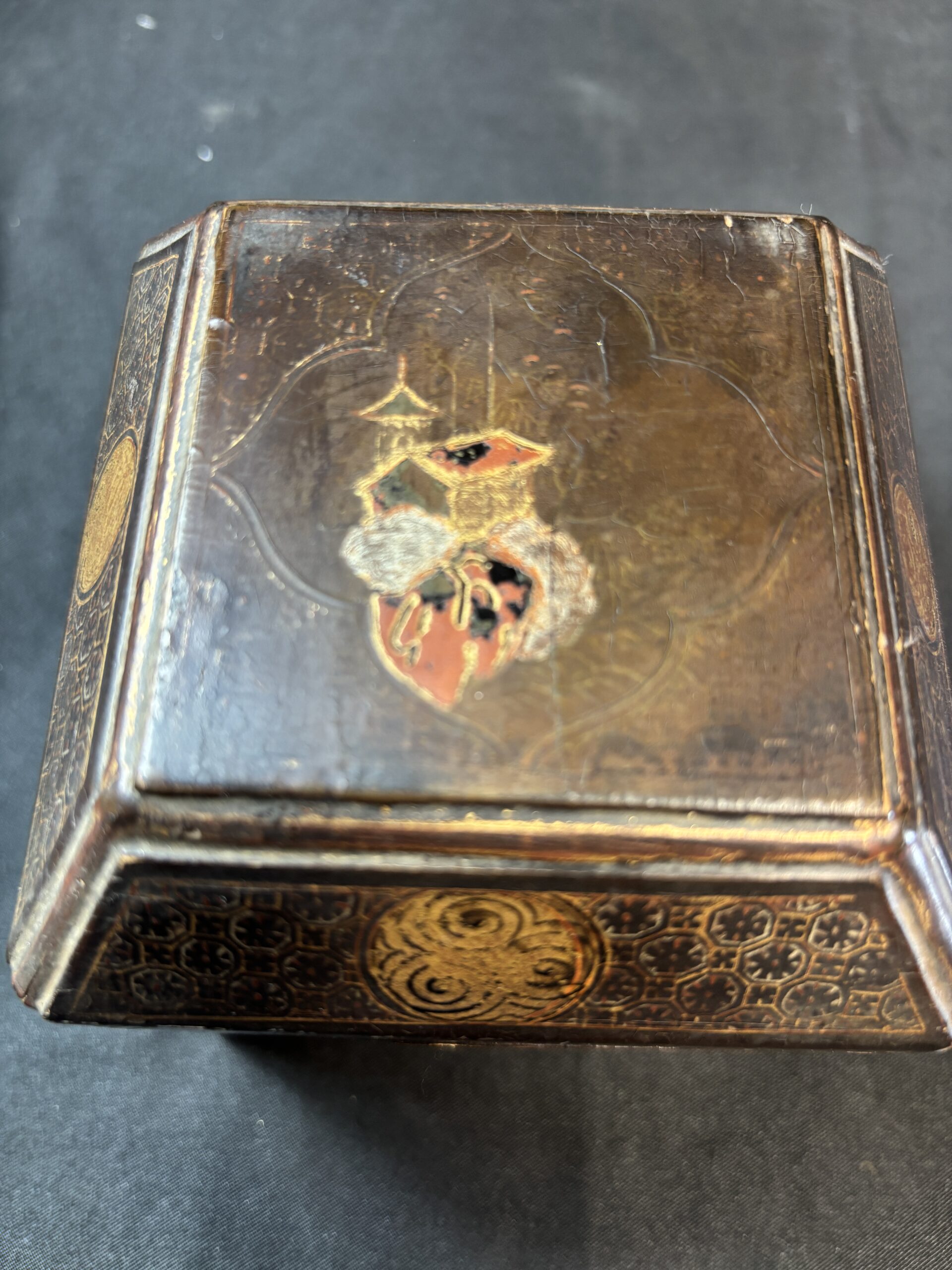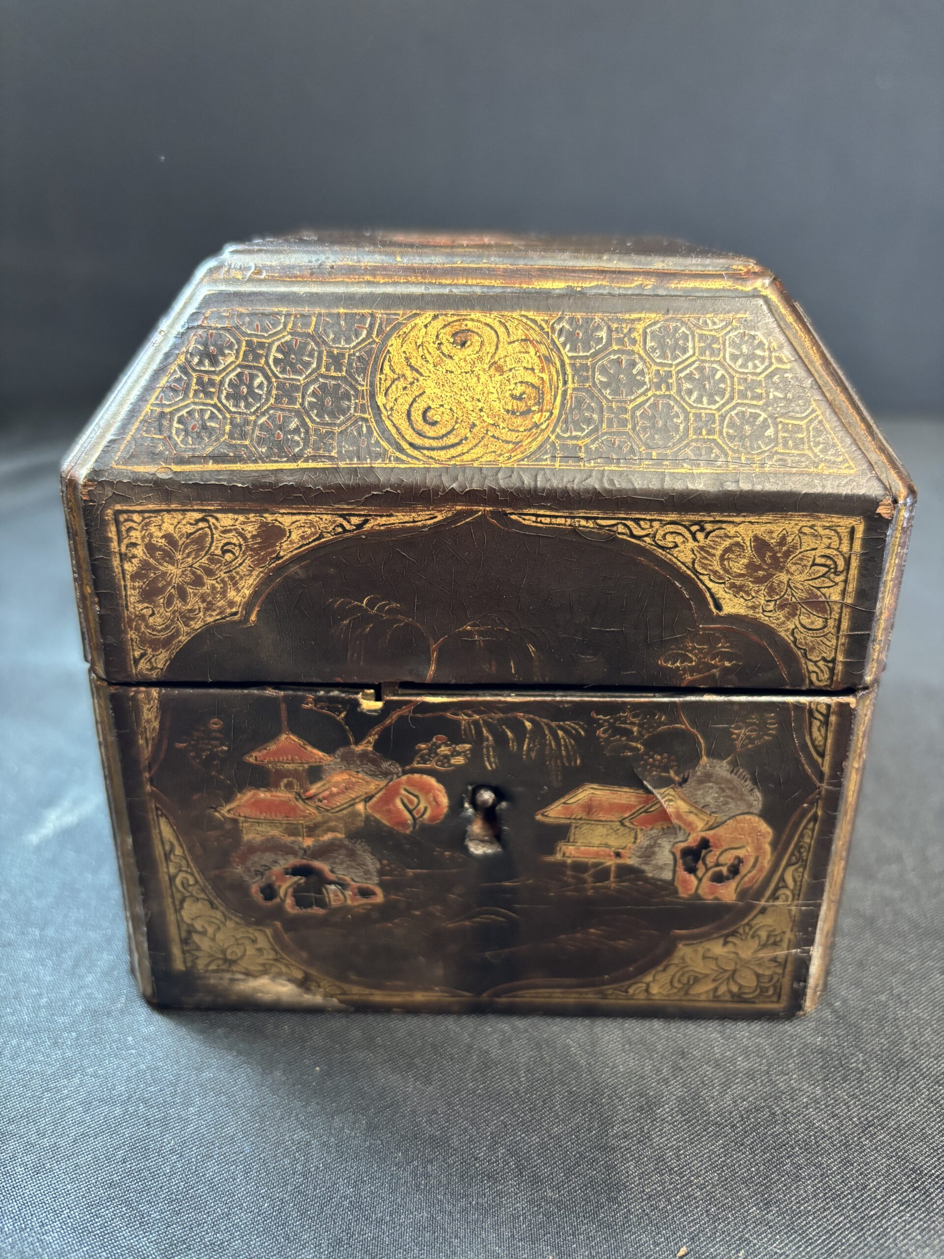 Chinese Tea Caddy (Circa 1880) decorated with Chinese Buildings and Trees, painted and gilded, 10cm x 10cm
