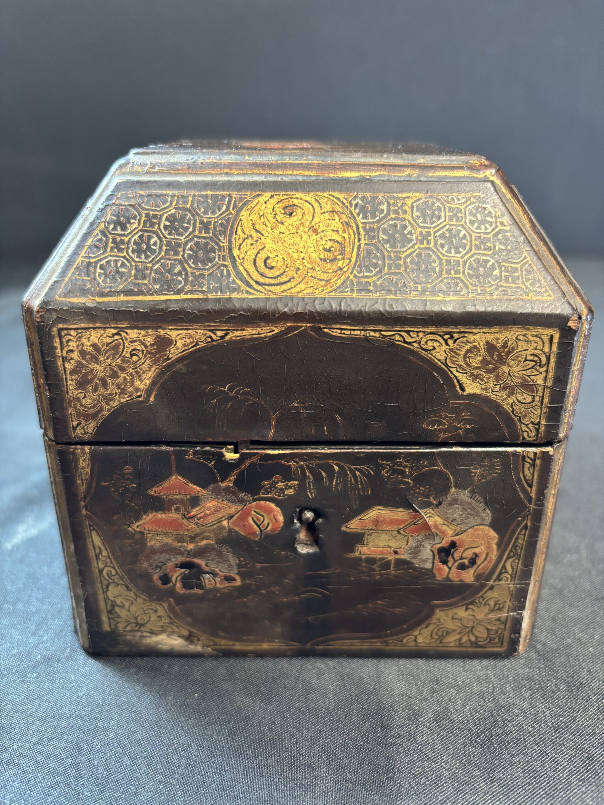 Chinese Tea Caddy (Circa 1880) decorated with Chinese Buildings and Trees (BNP)