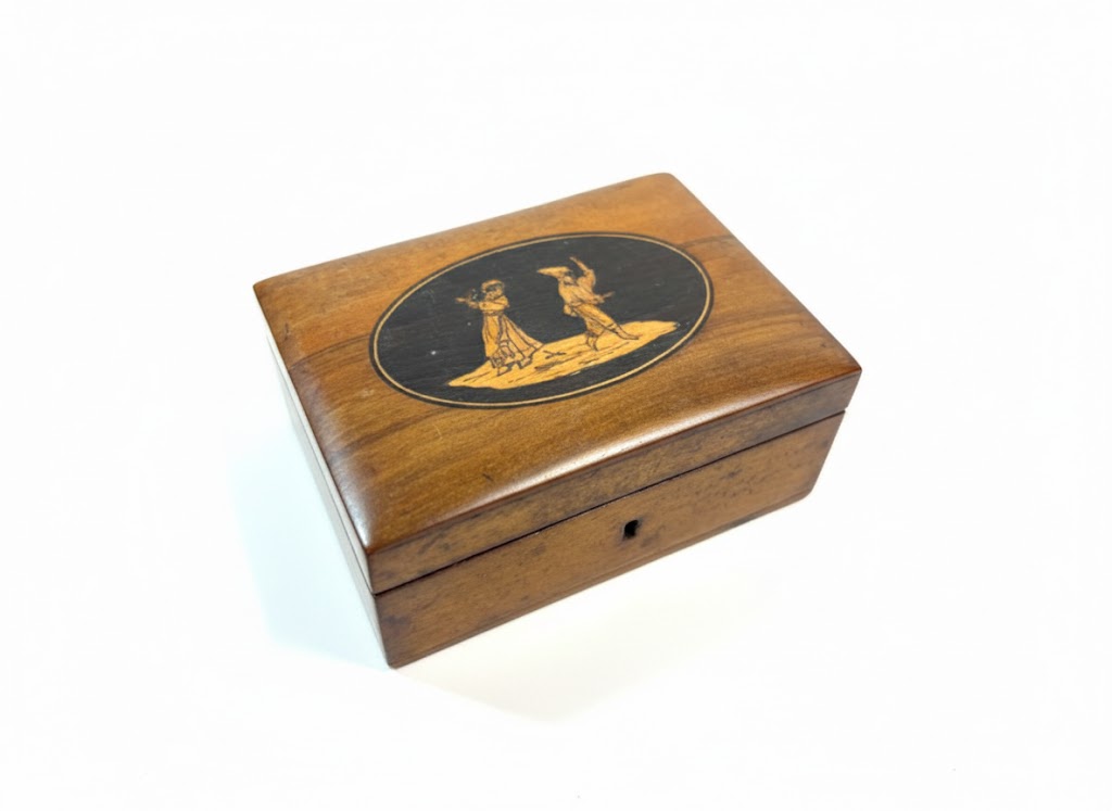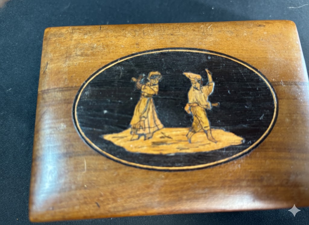 Italian 19th Century Sorrento Box in Olive Wood with inlaid Figures. Decorated with dancing figures, tourist pieces, approx 12cm x 8.5cm (IP)