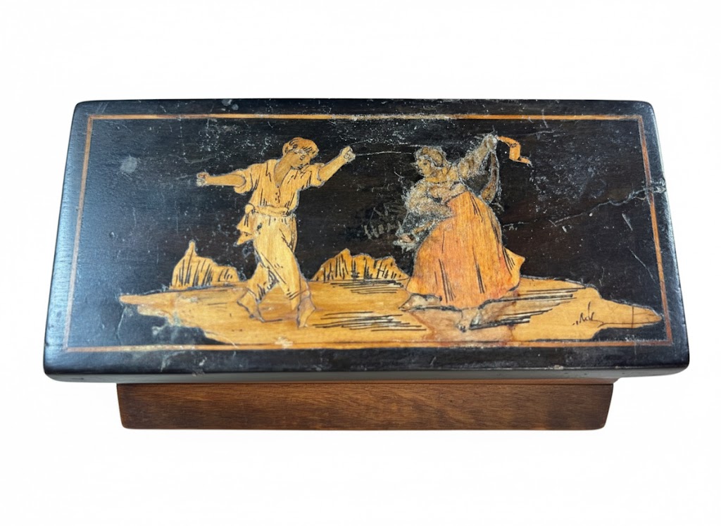 Italian 19th Century Sorrento Box in Olive Wood with inlaid Figures. Decorated with dancing figures, tourist pieces, approx 12cm x 6.5cm (IP)