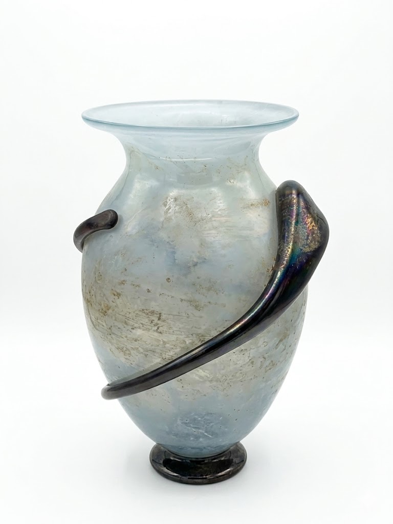 The Iridescent Spiral: Wrapping dynamically around the body is a thick, applied glass “serpent” handle. In stark contrast to the matte body, this element features a deep, metallic finish with a petroleum-slick iridescence. It glows with oil-on-water shades of violet, indigo, and gold, providing a powerful visual anchor that adds movement and energy to the piece.