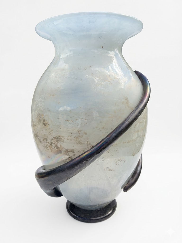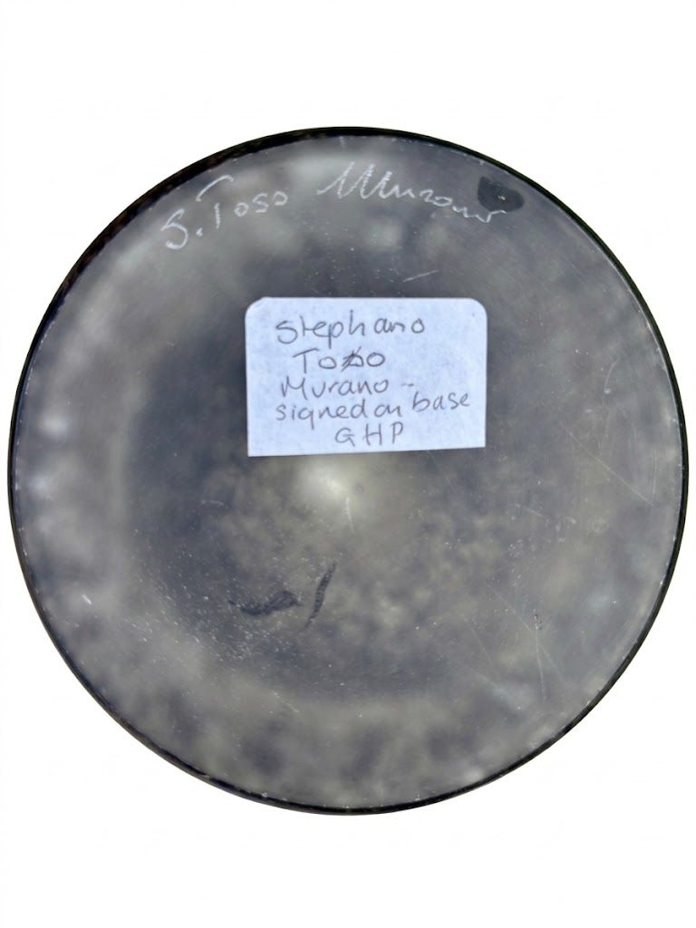 Stefano Toso’s work often explores the tension between the “raw” and the “refined.” By placing a highly polished, iridescent element against a rough, weathered background, he highlights the transformative power of heat and chemistry. This vase is a testament to the “New Murano” style—taking the techniques perfected by his ancestors and reinterpreting them through a lens of high-contrast minimalism.