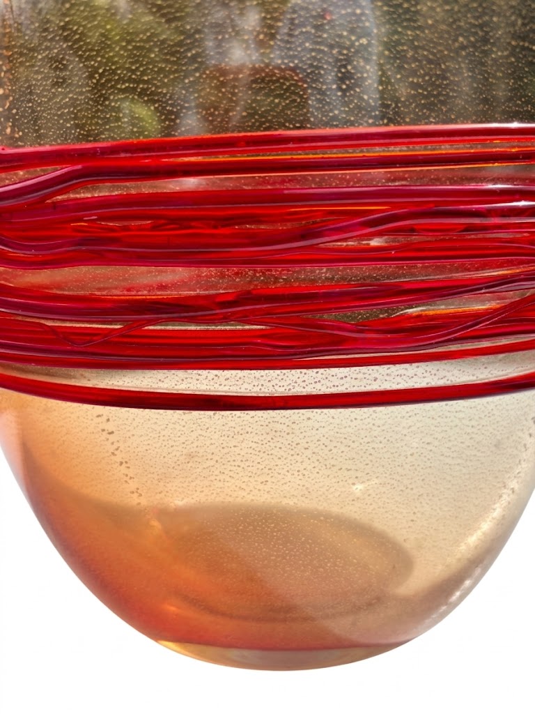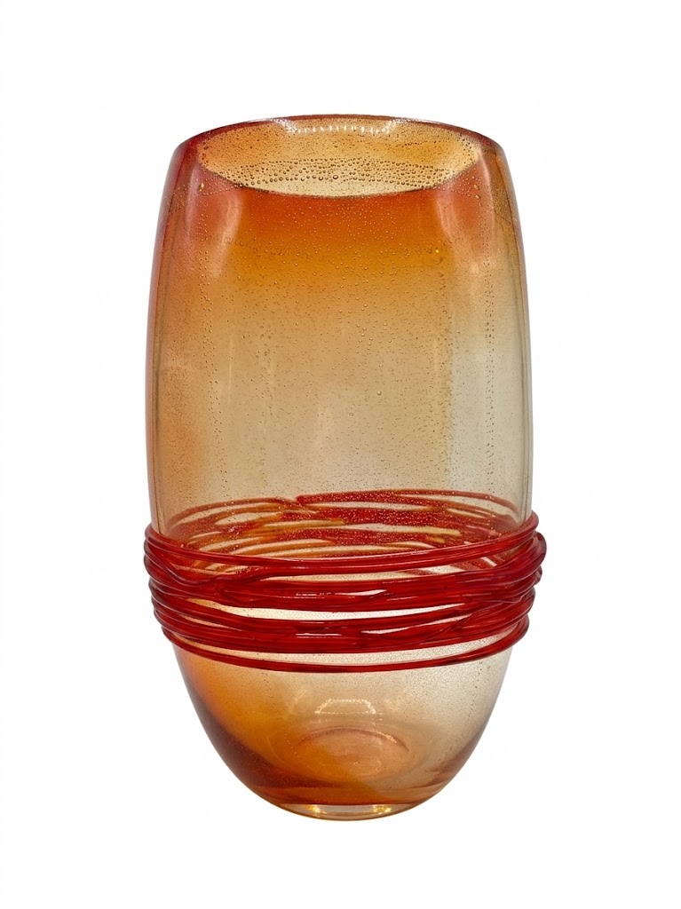 Red Glass Wrap: The lower third of the vase is encircled by multiple layers of vibrant red glass threading. This “wrapped” effect is applied while the glass is molten, adding a tactile, 3D element to the piece. The bold red acts as a sharp visual anchor against the softer golden tones of the body.