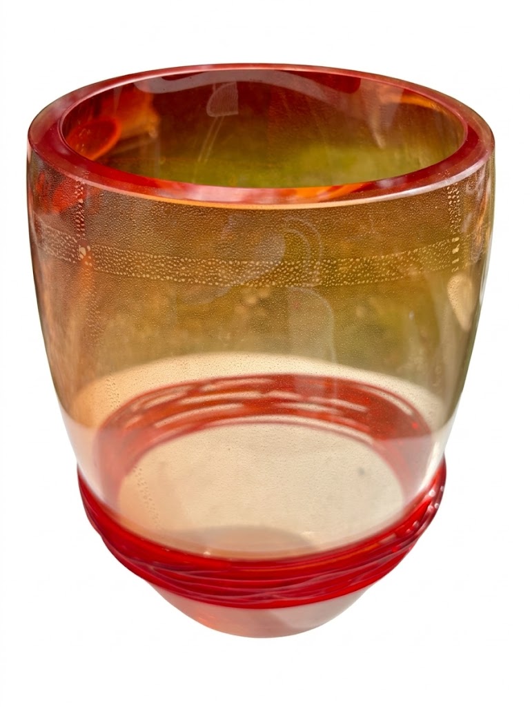 The Pulegoso Effect: The body of the vase is filled with thousands of tiny, controlled air bubbles (puleghe). This classic Murano technique creates a “fizzing” appearance, giving the glass an internal life and making it appear semi-opaque.Golden Amber Gradient: Infused within the glass is a rich amber and burnt orange gradient, further enhanced by the inclusion of 24kt gold leaf. The gold is suspended within the glass, catching the light to create a shimmering, metallic inner glow.
