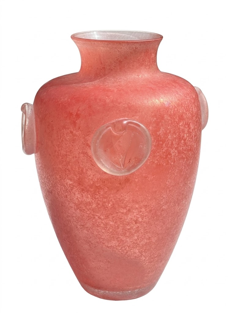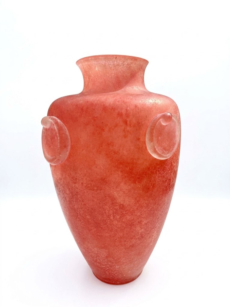 The Scavo Finish: The exterior has been treated with chemical salts and heat (or acid etching) to create a matte, pitted texture. This mimics the “weathered” look of glass that has been buried underground for centuries. Despite the matte finish, the glass retains a luminous quality, allowing light to pass through the body and highlight the variegated, almost “mottled” internal coloring.