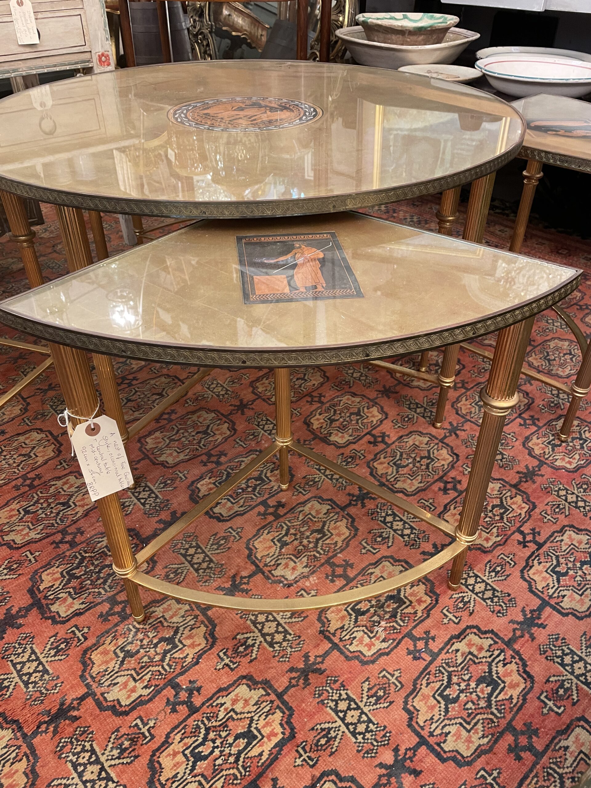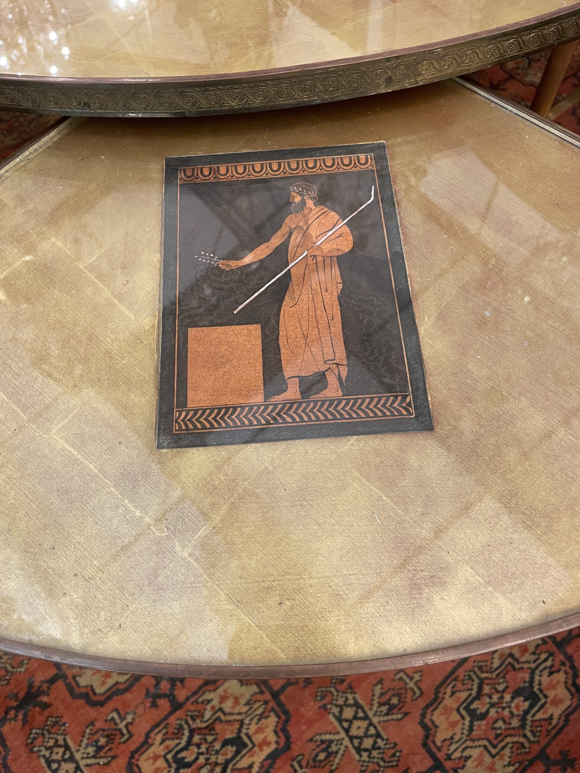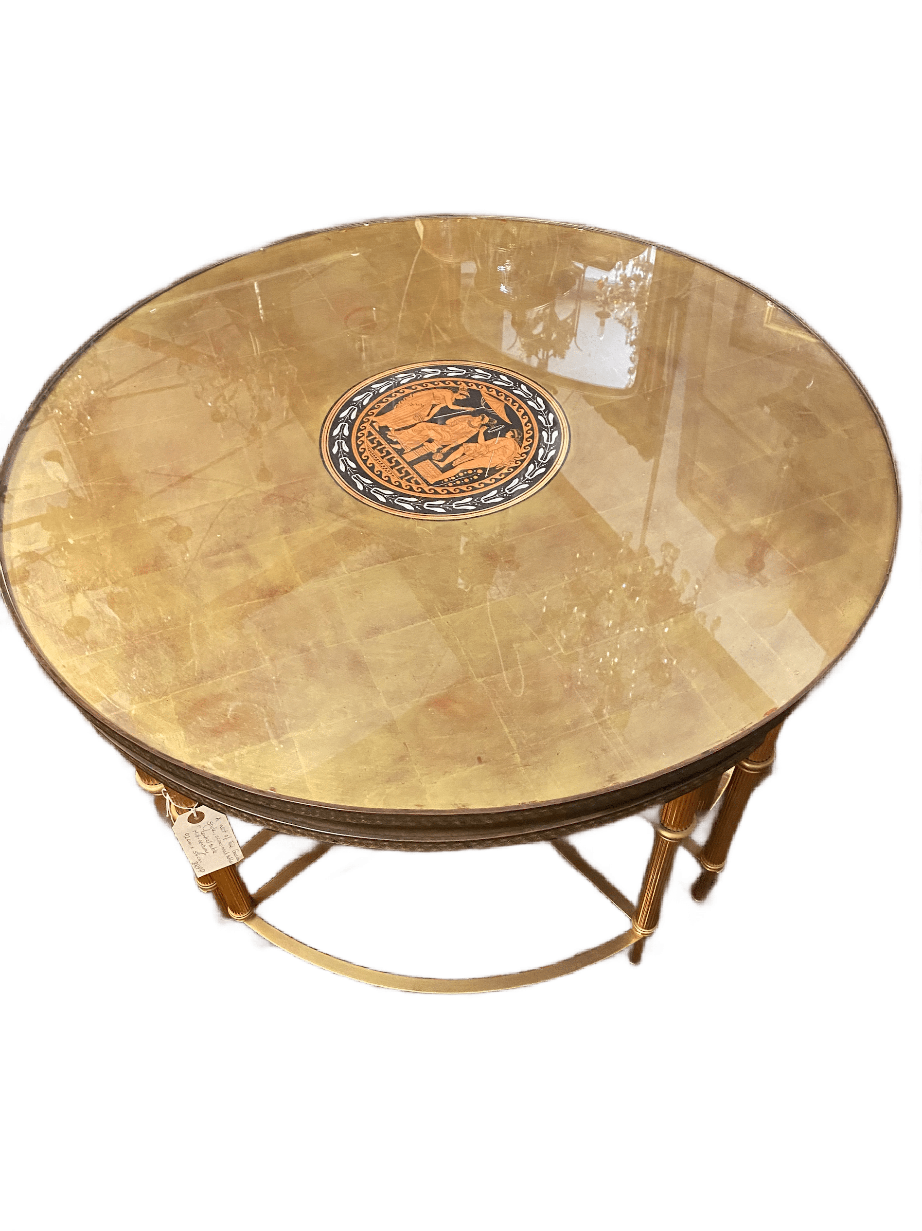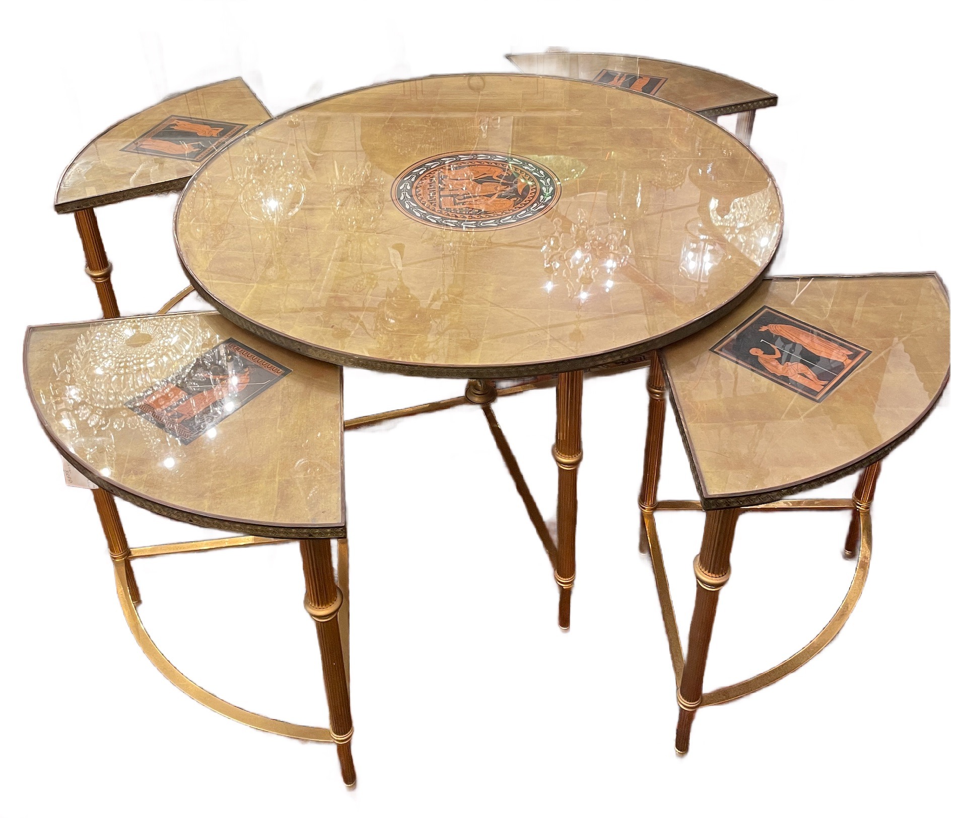 Gilded Fornassetti style table, with 4 corner tables. Featuring classic Greek-style illustrations) (circa 1960) 92cm(3ft) x 55cm(22″) high(BRPP)