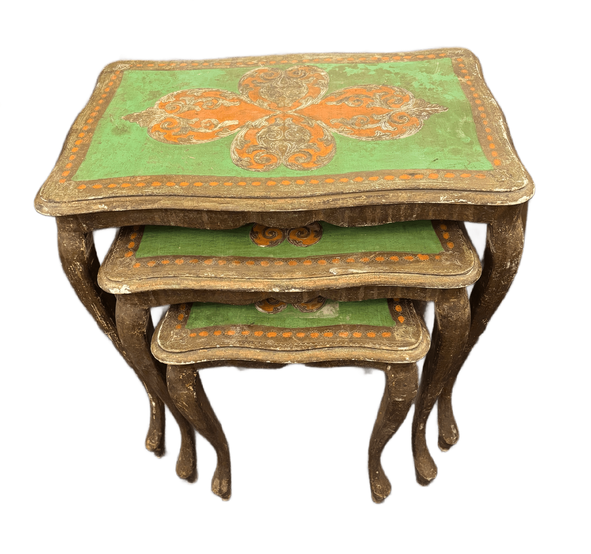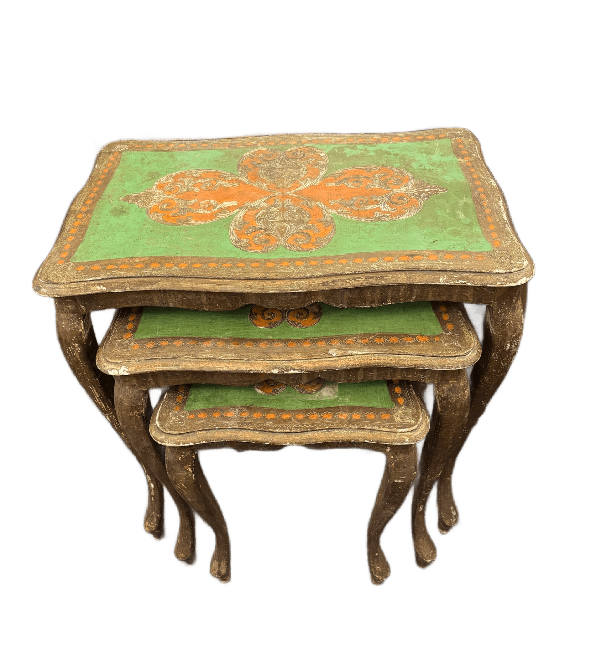 Nest of florentine tables in green and gold. (Circa 1940) The largest table being 54cm (21.5″) x 57cm (22″) (RNP)