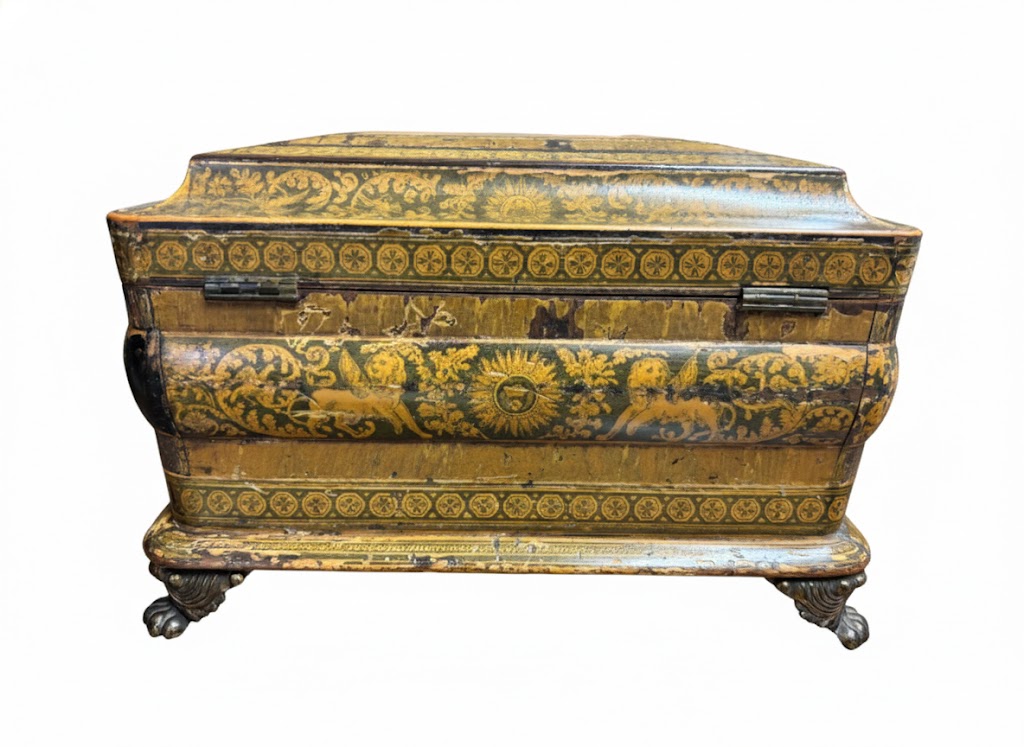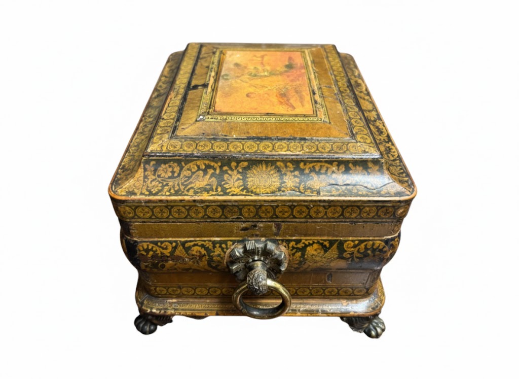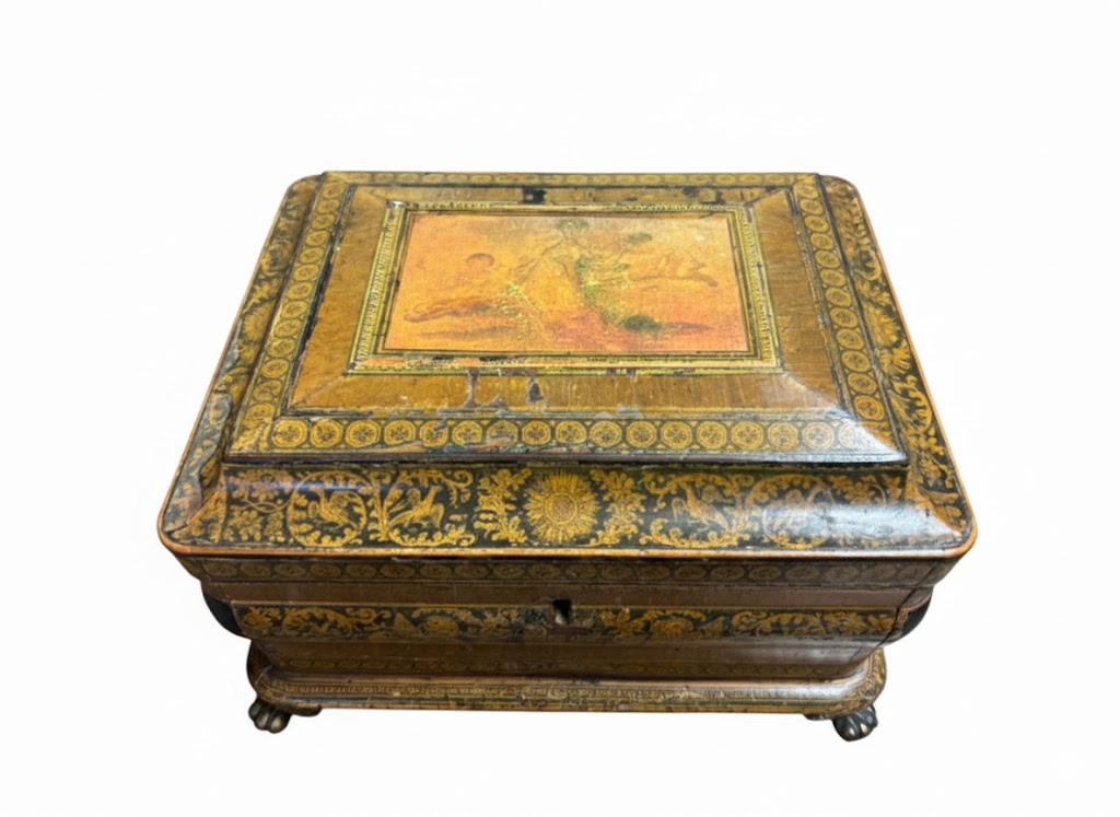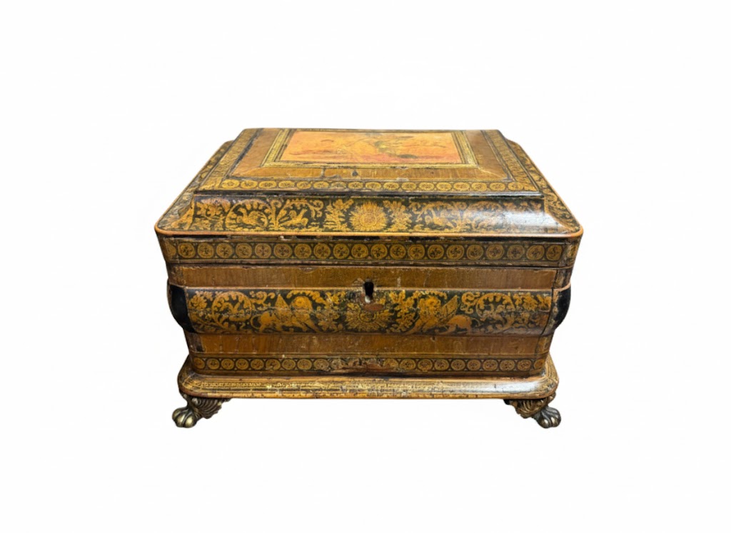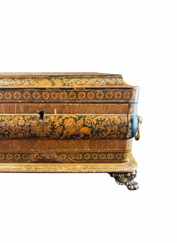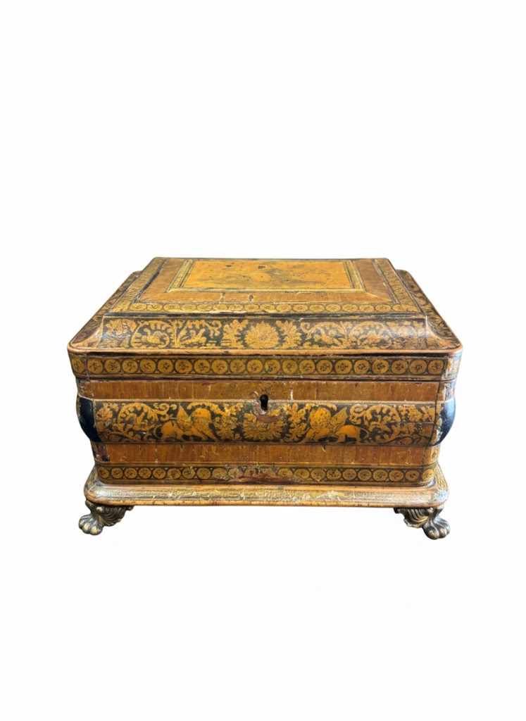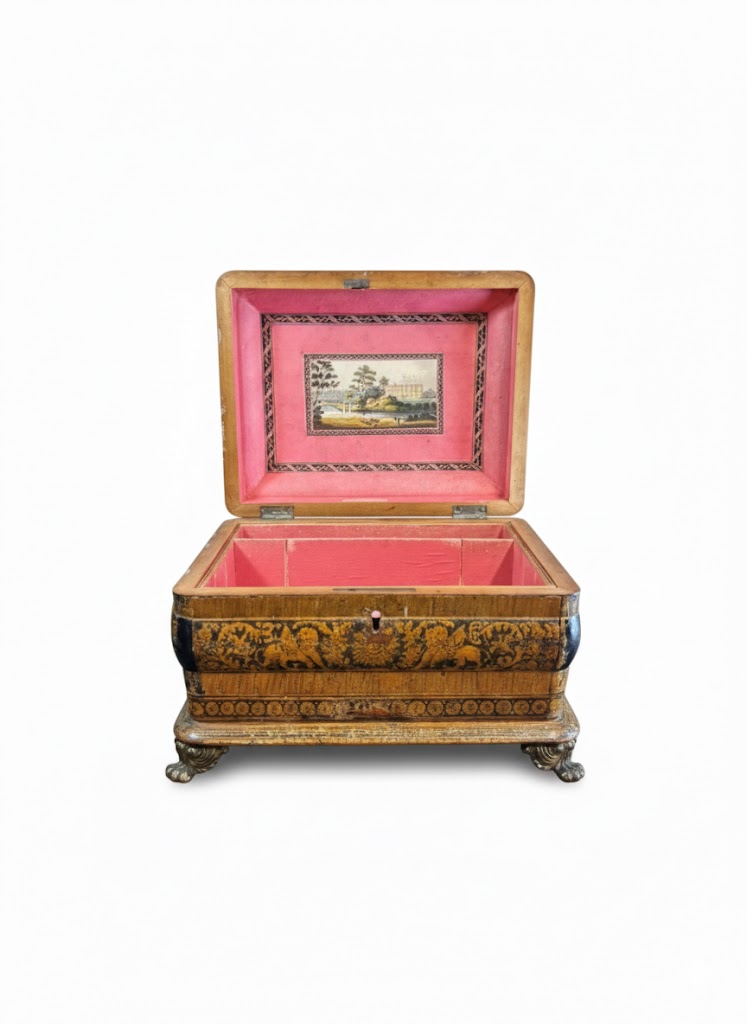 Regency Penwork box with Chinoiserie decoration, on bronze claw feet. Inlaid with pink satin.(IHP)