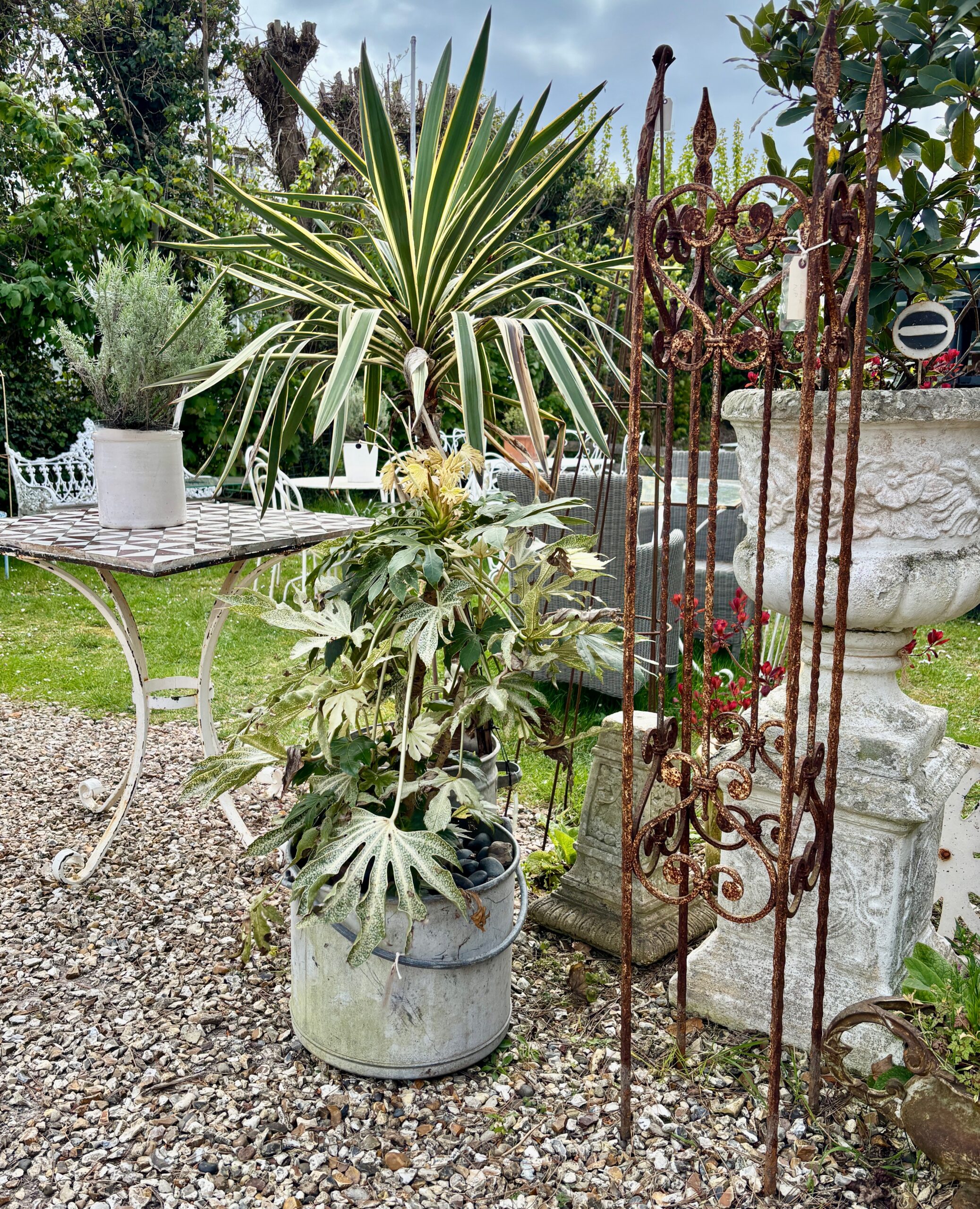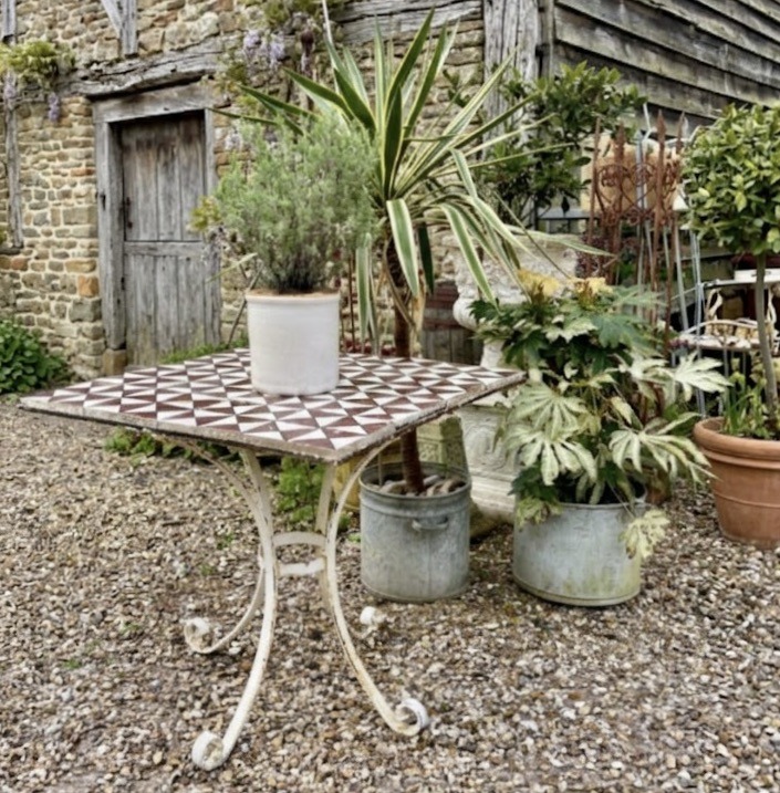Italian garden table with 100 year old antique Italian majolica tiles.